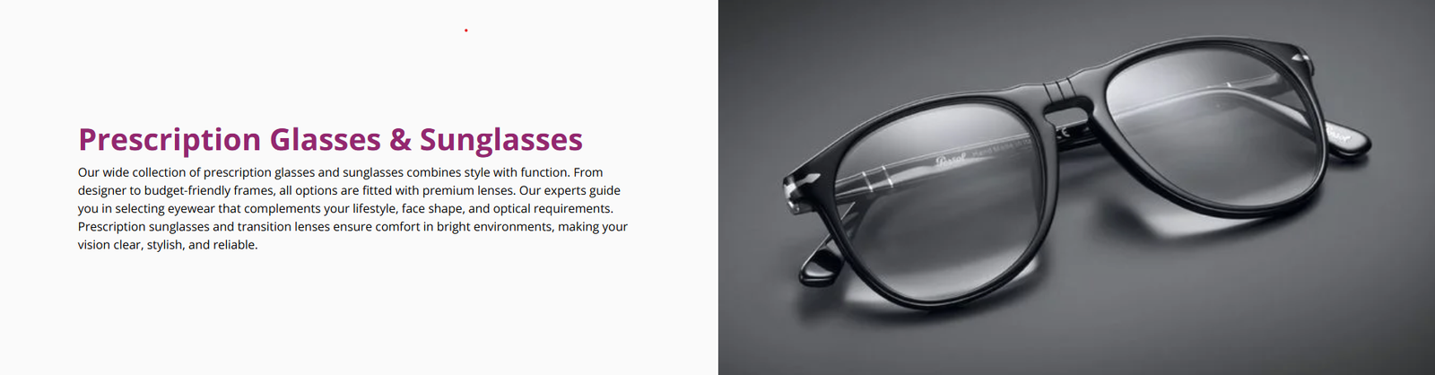 Our wide collection of prescription glasses and sunglasses combines style with function. From designer to budget-friendly frames, all options are fitted with premium lenses. Our experts guide you in selecting eyewear that complements your lifestyle, face shape, and optical requirements. Prescription sunglasses and transition lenses ensure comfort in bright environments, making your vision clear, stylish, and reliable.