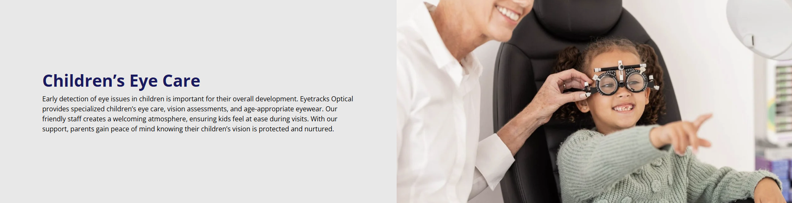 Early detection of eye issues in children is important for their overall development. Eyetracks Optical provides specialized children’s eye care, vision assessments, and age-appropriate eyewear. Our friendly staff creates a welcoming atmosphere, ensuring kids feel at ease during visits. With our support, parents gain peace of mind knowing their children’s vision is protected and nurtured.