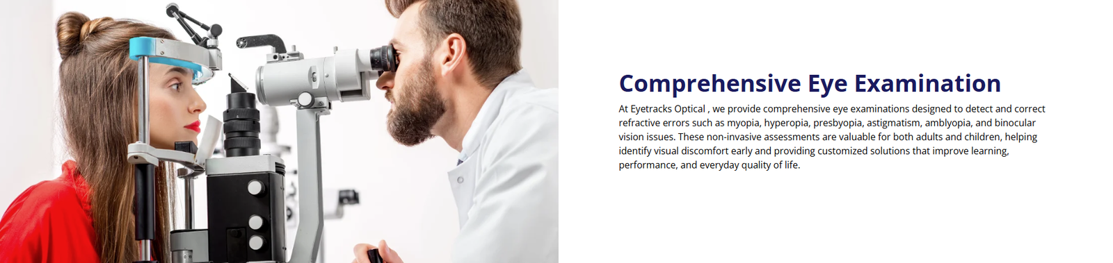 At Eyetracks Optical, we provide comprehensive eye examinations designed to detect and correct refractive errors such as myopia, hyperopia, presbyopia, astigmatism, amblyopia, and binocular vision issues. These non-invasive assessments are valuable for both adults and children, helping identify visual discomfort early and providing customized solutions that improve learning, performance, and everyday quality of life.